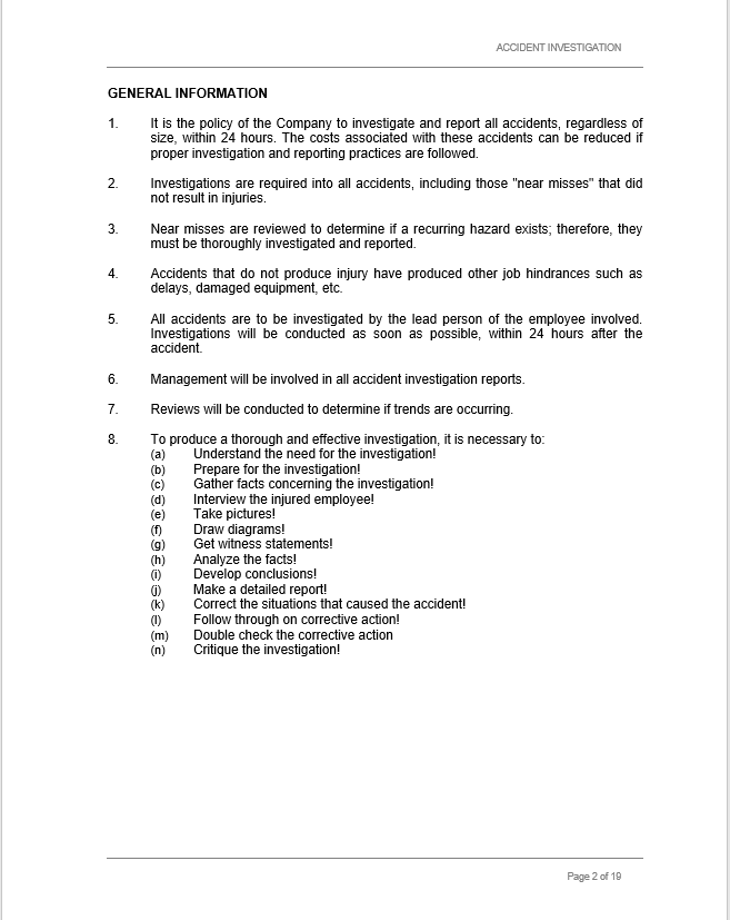 The accident investigation procedure will help guide you through the process of investigating an accident.